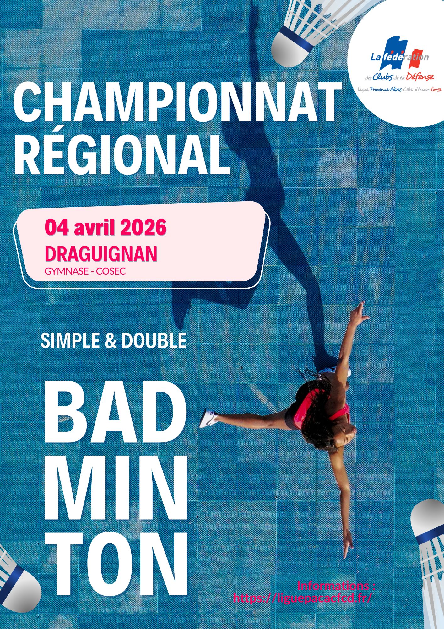 La Ligue Provence-Alpes-Côte d'Azur-Corse de la Fédération des Clubs de la Défense organise le championnat régional de Badminton. Les inscriptions sont d'ores et déjà ouvertes sur Sygema.